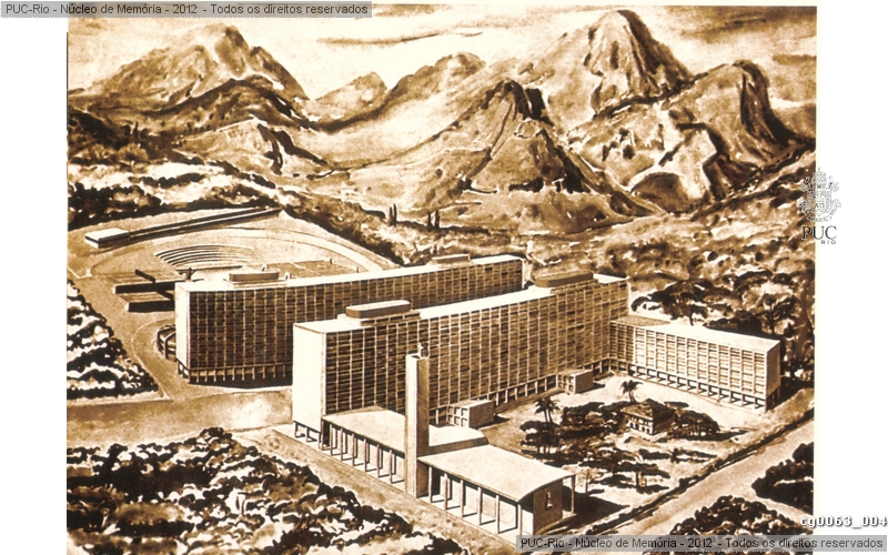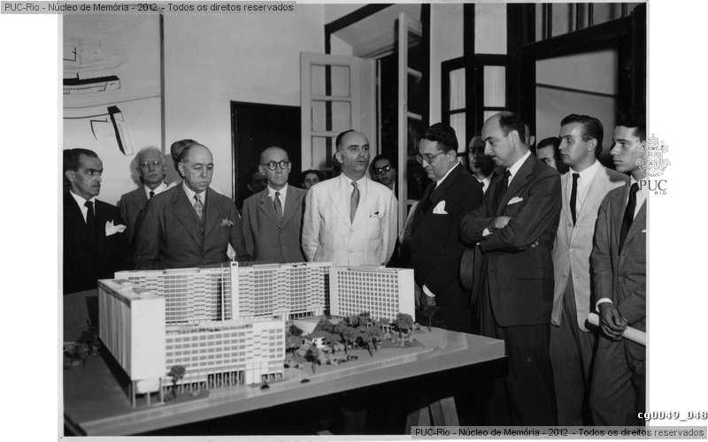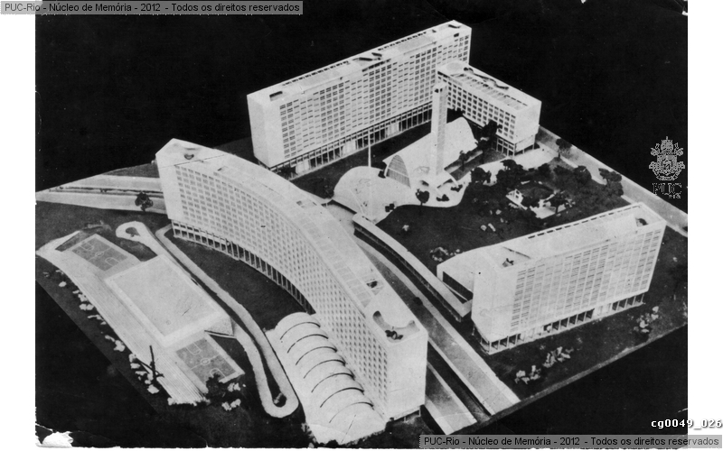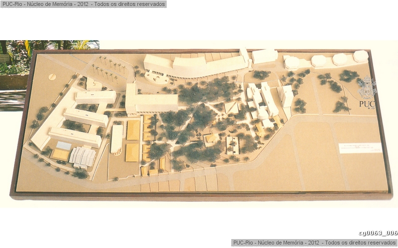 Maquetes de prédios construídos e projetados para o campus da PUC-Rio em diversas épocas.