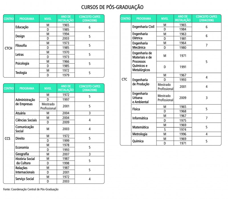 Por Centro, Mestrado e Doutorado, com o ano de instalação e o conceito da Capes.