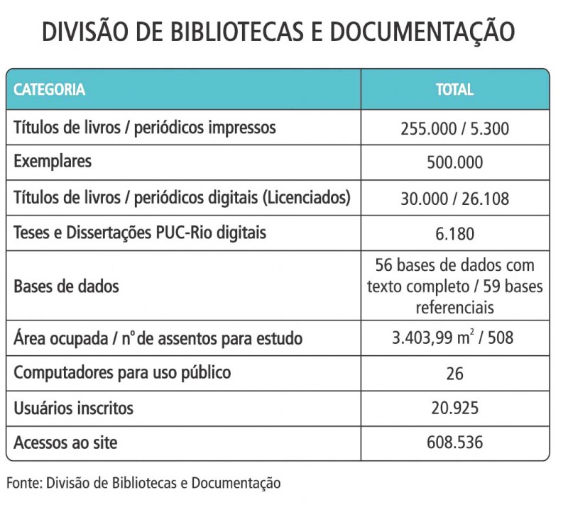 Total de livros, teses e dissertações disponíveis nas bibliotecas da Universidade; área útil, computadores e usuários inscritos.