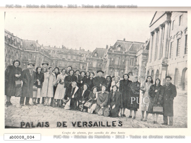 ab0008_004 | 1950 | Pe. Pedro Cerruti S.J., com grupo de alunos da Universidade Católica no Palácio de Versalhes por ocasião do Ano Santo. |