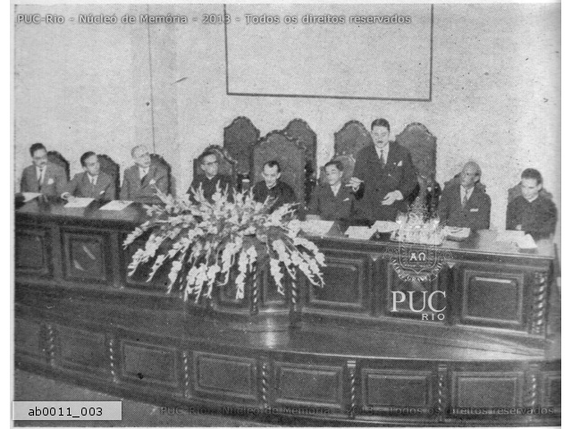 ab0011_003 | 1953 | Mesa com o reitor pe. Pedro Belisário Velloso Rebello S.J., dom Helder Camara, pe. Ormindo Sodré Viveiros de Castro S.J., e outras autoridades, na instalação dos cursos do Instituto de Psicologia Aplicada. |