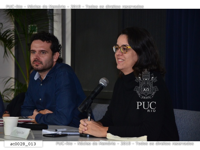 ac0028_013 | 6/6/2019 | O palestrante, Luiz Felipe Lacerda, da UNICAP e do Observatório Nacional de Justiça Socioambiental Luciano Mendes de Almeida - OLMA e Virgínia Totti, do Departamento de Direito PUC-Rio e NIMA PUC-Rio, como moderadora, na palestra sobre territórios coletivos e direitos humanos na Amazônia. |