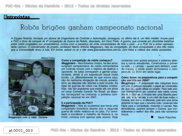 ak0001_003 | 2004 | Artigo do Boletim PUC Urgente, "Robôs brigões ganham campeonato nacional". |
