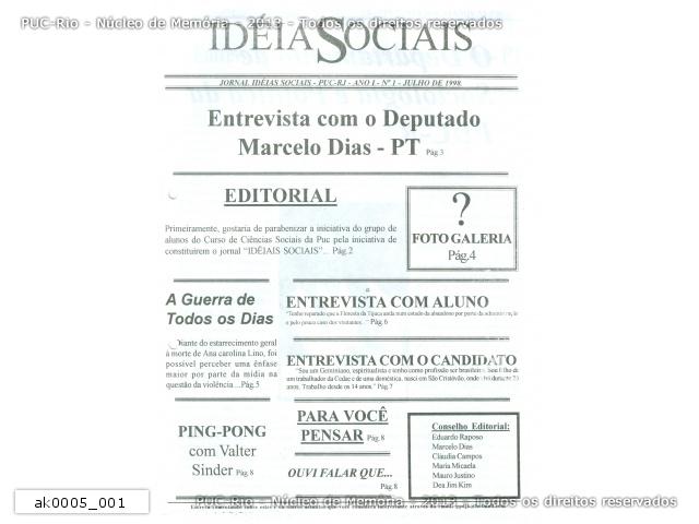 ak0005_001 | 7/1998 | Capa. Primeira edição do jornal do Curso de Ciências Sociais Ideias Sociais, Julho/1998, Ano 1, no. 1. Conselho editorial: Eduardo Raposo, Marcelo Dias, Claudia Campos, Maria Micaela, Mauro Justino, Dea Jim Kim. |
