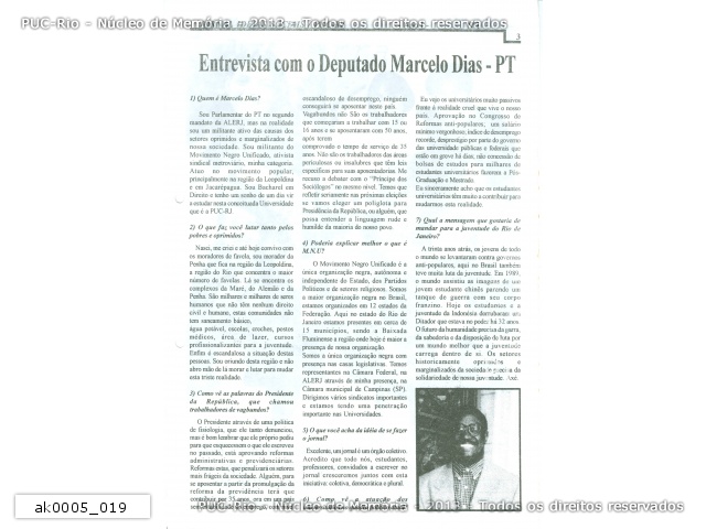 ak0005_019 | 7/1998 | Página 03, ano 1, num. 1 Julho/1998. "Entrevista com o Deputado Marcelo Dias - PT". Foto do Deputado Marcelo Dias. Fala do Movimento Negro Unificado, entre outros assuntos. |