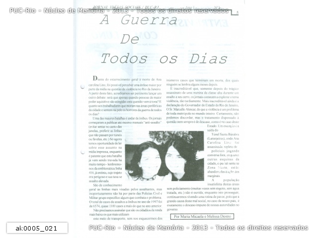 ak0005_021 | 7/1998 | Página 05, ano 1, num. 1, Julho/1998. "A Guerra de Todos os Dias", sobre assaltos e insegurança nos ônibus. Assinado por Maria Micaela e Melissa Destro. Fotografia sem legenda. |