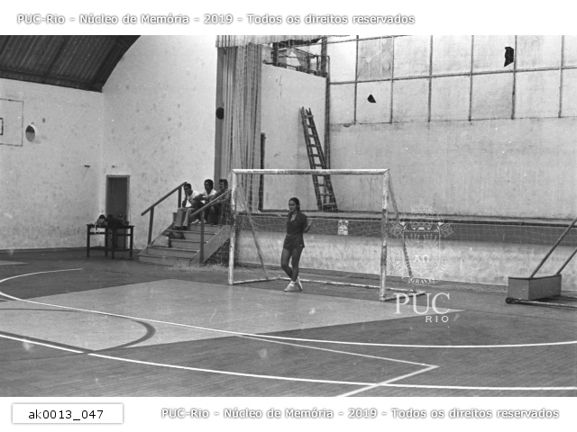 Acervo do professor Alfredo Jefferson relacionado à eventos na PUC-Rio - ak0013_047 ak0013_047 1979 Alunas jogam futebol de salão. A solidão da goleira.