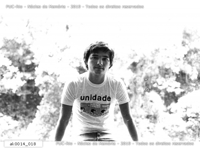 ak0014_018 | 1979 | Aluno com camiseta da chapa Unidade, com charge da Mafalda. |