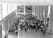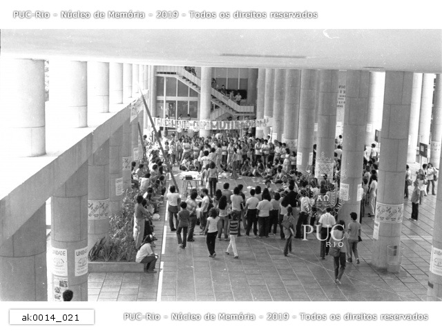 ak0014_006 | 1979 | Alunos colocam faixas da chapa Travessia nos pilotis. Outros, com a camiseta da chapa Mutirão, observam. |