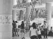 ak0014_007 | 1979 | Alunos colocam faixas da chapa Travessia nos pilotis. Cartazes das chapas Mutirão e Unidade.. |