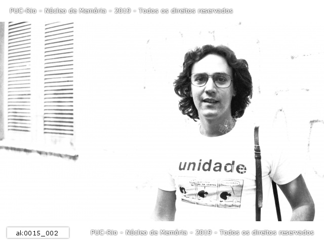 ak0015_003 | 1979 | Estudante integrante da chapa Unidade, usa camiseta com tirinha da Mafalda, na qual Mafalda encontra a pequena menina chamada Liberdade. |