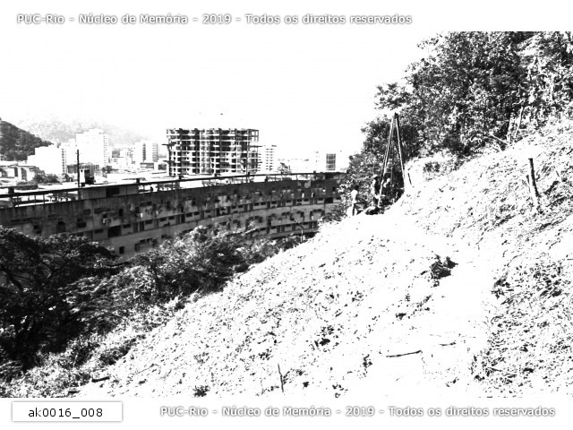 ak0016_018 | 1980 | Vista dos fundos do Edifício Cardeal Leme a partir do morro onde estava sendo construído o túnel acústico da Auto-estrada Lagoa-Barra. Vê-se o teto do ITUC. |
