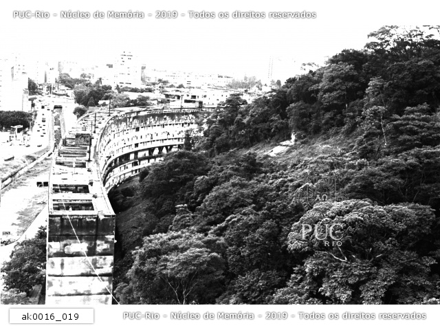 ak0016_019 | 1980 | Vista do Minhocão, da Av. Padre Leonel Franca e da Praça Sibélius a partir do alto do Edifício Cardeal Leme, durante a construção do túnel acústico da Auto-estrada Lagoa-Barra. |