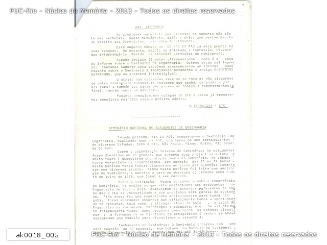 ak0018_005 | 10/1977 | "Aos leitores" e reportagem sobre o Seminário Nacional de Estudantes de Engenharia, realizado na PUC-Rio, com 300 participantes. Jornal do CTC da chapa Alternativa, do movimento estudantil da PUC-Rio, número 02. |