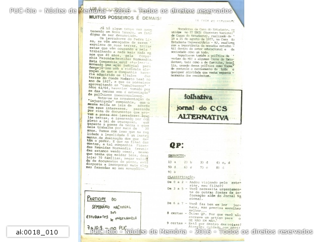ak0018_010 | 10/1977 | Jornal do CTC da chapa Alternativa do movimento estudantil da PUC-Rio, número 02. Anúncio do jornal Folhativa, jornal do CCS da chapa Alternativa. Artigo: Um é pouco, dois é bom, muitos posseiros é demais. II Encontro Nacional da Casa do Estudante. O Seminário Nacional dos Estudantes de Engenharia ocorrera na PUC entre 07 e 10 de setembro. |