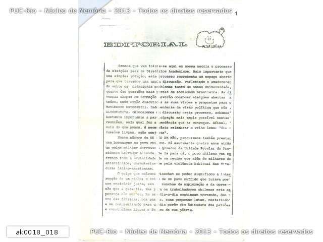 ak0018_018 | 1977 | Editorial. Jornal da chapa Alternativa, no CTC, do movimento estudantil da PUC-Rio, número 03. Refere-se às eleições para os diretórios acadêmicos que ocorreria na semana seguinte, e ao golpe que ocorrera no Chile por parte do general Pinochet, derrubando o presidente Salvador Allende. |