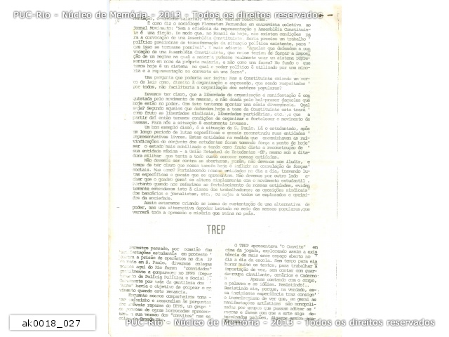 ak0018_027 | 1977 | Continuação do debate sobre a Constituinte; TREP - Teatro de Resistência dos Estudantes da PUC. Jornal da chapa Alternativa, do CTC, do movimento estudantil da PUC-Rio, número 03. |