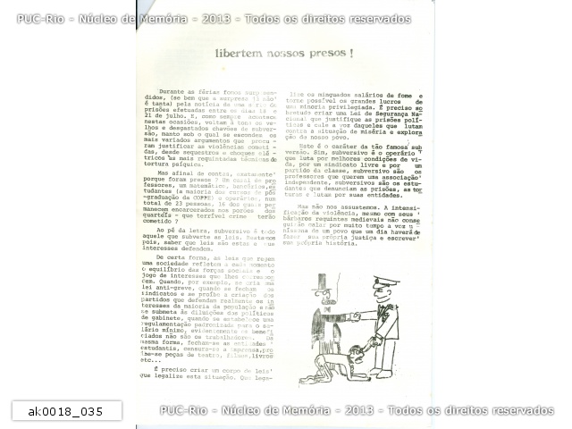 ak0018_035 | 1977 | Artigo sobre as prisões de militantes durante as férias de Julho. Jornal da chapa Alternativa, do CTC, do movimento estudantil da PUC-Rio, sem número. |