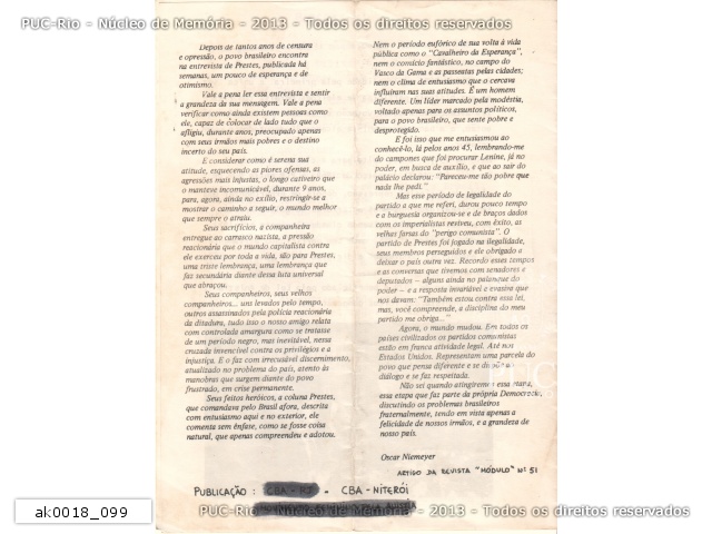 ak0018_099 | 1979 | Texto de Oscar Niemeyer, artigo da revista Módulo (nº51). Panfleto sobre Luiz Carlos Prestes, possivelmente distribuído após a volta de Prestes ao Brasil, no final de 1979. |