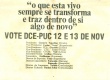 ak0018_050 | 1980 | Capa, parte 2, chapa para o DCE. texto: "O que está vivo sempre se transforma e traz dentro de si algo de novo". Datas das eleições para o DCE: 12 e 13 de novembro. |