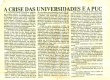 ak0018_051 | 1980 | Artigo: "A crise das universidades e a PUC". Demandas resumidas ao final do texto, algumas genéricas, outras mais diretamente relacionadas a PUC-Rio: aumento anual das mensalidades, participação nos órgãos colegiados, participação de DCE e ADPUC na elaboração de regimento e estatutos da Universidade, eleições diretas para todos os cargos. |