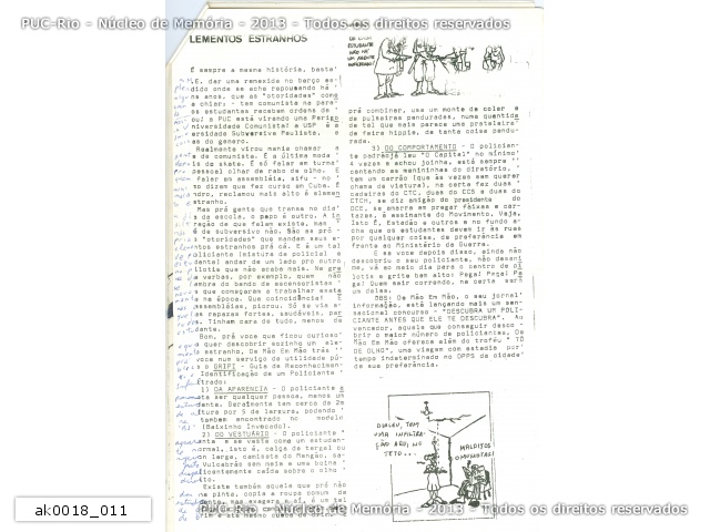 ak0018_011 | 10/1977 | Reportagem. Jornal do CTC da chapa Alternativa, do movimento estudantil da PUC-Rio, número 02. "Guia de reconhecimento e identificação de um policiante infiltrado". Mesma página do registro ak0018_006, aparentemente repetida por conta da má impressão, com partes mais legíveis e outras não. |