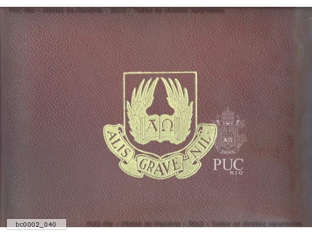 bc0002_040 | 1947 | Capa do álbum de Bacharéis em Direito de 1947, com o brasão antigo da PUC-Rio, em dourado. |