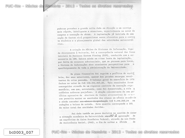 bc0003_007 | 1976 | Relatório do Reitor da PUC-Rio de 1976, p. 7. É um rascunho, há correções manuscritas. Criação do Núcleo de Sistemas de Informação, assessoria da IBM, balanço financeiro de 1976, bolsas concedidas, empréstimo na Caixa Econômica Federal. |