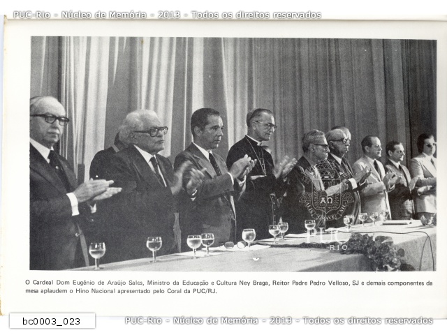 bc0003_023 | 11/3/1975 | Aula Inaugural com a presença do Ministro da Educação e Cultura, Ney Braga. Aplausos à execução do Hino Nacional pelo Coral da PUC. |