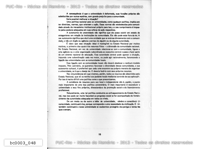 bc0003_032 | 3/1979 | O Relatório apresenta o balanço das atividades acadêmicas da PUC-Rio do ano de 1978. A publicação contém informações do corpo docente e discente, da Associação dos Docentes (ADPUC) e da Associação de Funcionários (AFPUC), do projeto de reformulação da Regulamentação da Carreira Docente e dos convênios estabelecidos com a FUNARTE, FINEP, BNDE, MEC, IPHAN, entre outros. Destaca os projetos, os eventos, as palestras e os seminários realizados em 1978 e traz também dados sobre a situação financeira da Universidade e das bolsas de estudos. O Relatório foi apresentado pelo reitor pe. João Mac Dowell S.J. na abertura do ano acadêmico em 09 de março de 1979. |