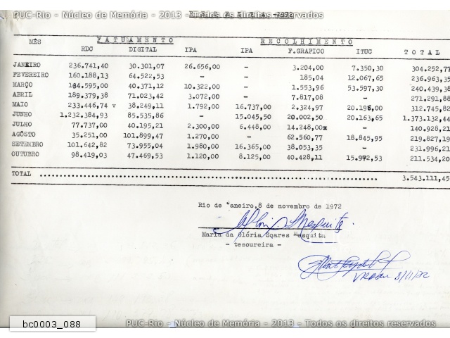 bc0003_088 | 8/11/1972 | Receitas da Universidade entre janeiro e outubro de 1972. |