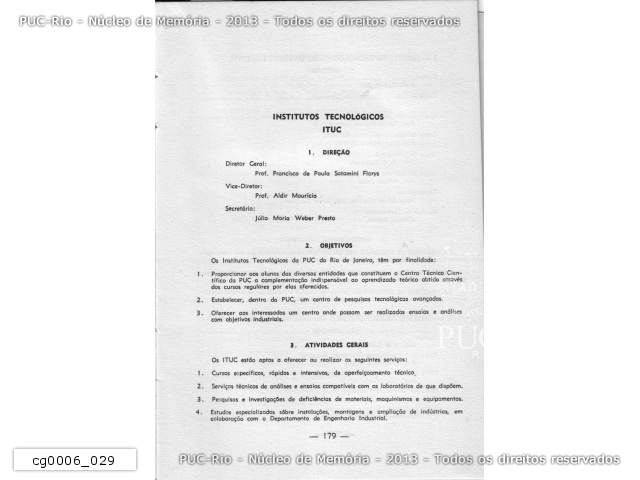 cg0006_029 | 1966 | Página 179 do Catálogo Escolar do Centro Técnico Científico. Nomes dos membros da direção, os objetivos e as atividades gerais do ITUC. |