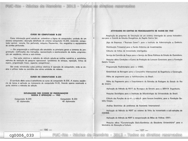 cg0006_033 | 1966 | Páginas 186 e 187 do Catálogo Escolar do Centro Técnico Científico. Curso do computador B-205, Curso do computador B-200, Diplomados nos cursos de Programação Básica e Operação - 1965, Atividades do Centro de Processamento de Datos - 1965. |