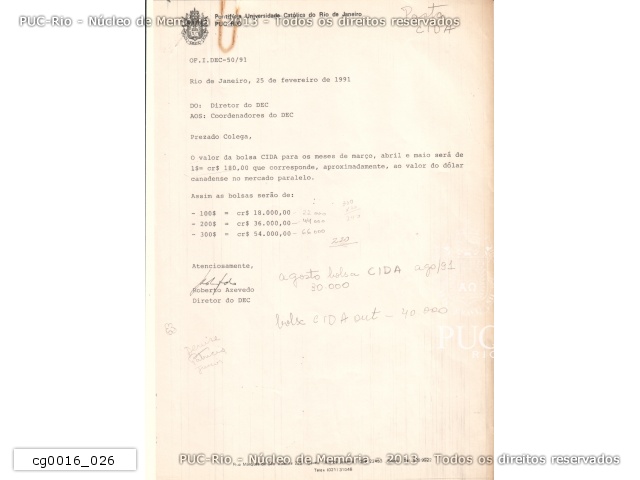 cg0016_026 | 25/2/1991 | Correspondência do diretor para os coordenadores do Departamento de Engenharia Civil (CIV) contendo os valores de bolsa CIDA com relação ao Dólar Canadense, no mercado paralelo. |