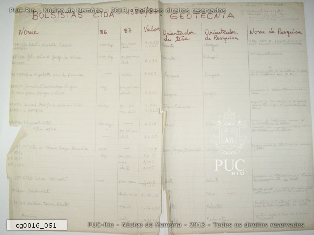 cg0016_051 | 1987 | Planilha manual de controle dos bolsistas CIDA referente aos anos de 1986 e 1987. |
