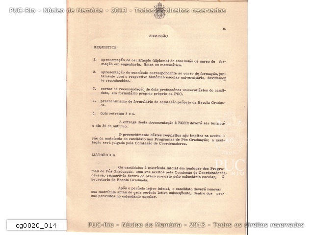 cg0020_014 | 1968 | Seção referente à 'Admissão', no Catálogo oficial da Escola Graduada de Ciências e Engenharia (EGCE), 1968 - 1969. |