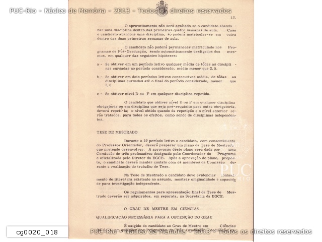 cg0020_018 | 1968 | Seção referente aos 'Programas de estudo' e ao 'grau de mestre em ciências' no Catálogo oficial da Escola Graduada de Ciências e Engenharia (EGCE), 1968 - 1969. |