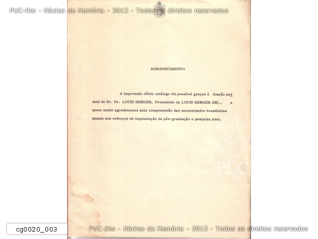 Agradecimento publicado no Catálogo oficial da Escola Graduada de Ciências e Engenharia (EGCE), 1968 - 1969. |
