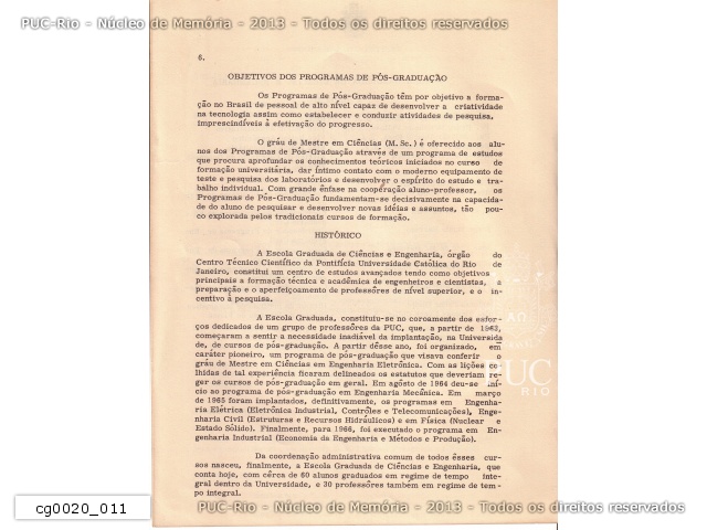 Seção referente aos 'Objetivos dos programas de pós-graduação' e ao 'Histórico' no Catálogo oficial da Escola Graduada de Ciências e Engenharia (EGCE), 1968 - 1969. |