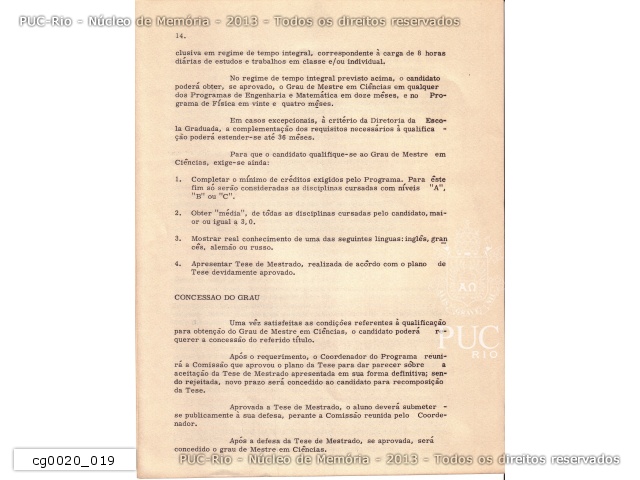 Seção referente ao 'grau de mestre em ciências' no Catálogo oficial da Escola Graduada de Ciências e Engenharia (EGCE), 1968 - 1969. |