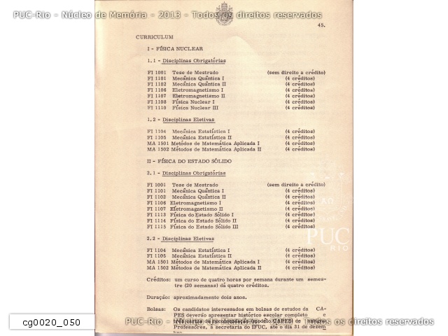 Seção referente à 'Física', que contém o curriculum, no Catálogo oficial da Escola Graduada de Ciências e Engenharia (EGCE), 1968 - 1969. |
