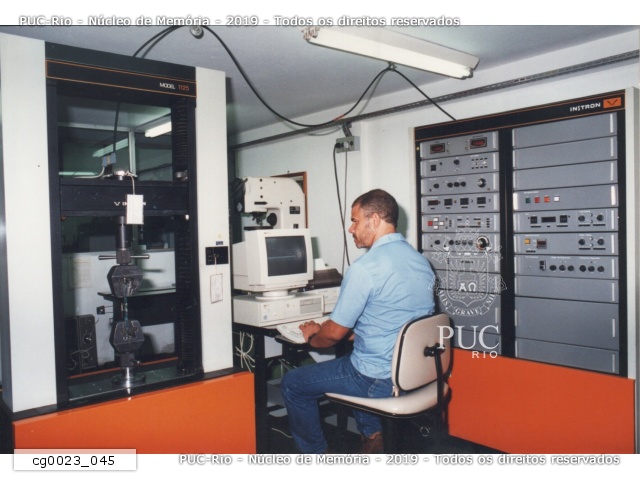 cg0023_045 | 1995 | Pessoa opera equipamento em laboratório com apoio de microcomputador. Máquina de teste Instron Model 1125 utilizada para a realização de testes de tração. |