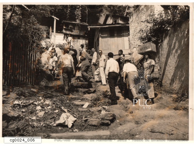 cg0024_006 | 1951 | Visita de grupo da Escola de Serviço Social ao morro do Cantagalo. Pessoas sobem uma escadaria em direção a barracos de madeira. Um homem descalço carrega um caixote na cabeça. |