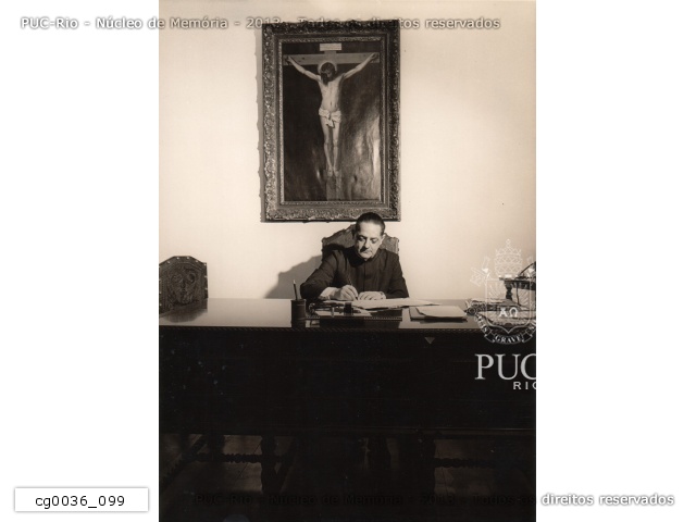 cg0036_099 | 1965 | Padre Laércio Dias de Moura S.J. em sua mesa de trabalho. |