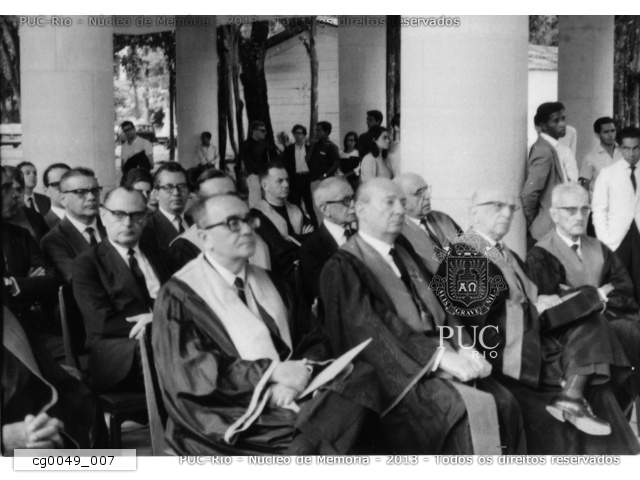 cg0049_007 | 30/10/1965 | Parte da plateia presente na comemoração do Jubileu de Prata da PUC-Rio. Na ocasião, com a presença do Embaixador da Alemanha Ocidental, foi inaugurado o prédio da Biblioteca Central e as novas instalações da Reitoria, ainda em obras, e houve a entrega das medalhas Cardeal Leme aos professores e o descerramento das placas aos benfeitores. |