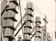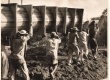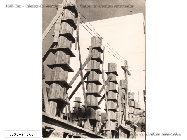cg0049_050 | 1953 | Trabalhadores carregando a fôrma de um dos pilotis da PUC-Rio, pilares físicos e simbólicos da Universidade. |