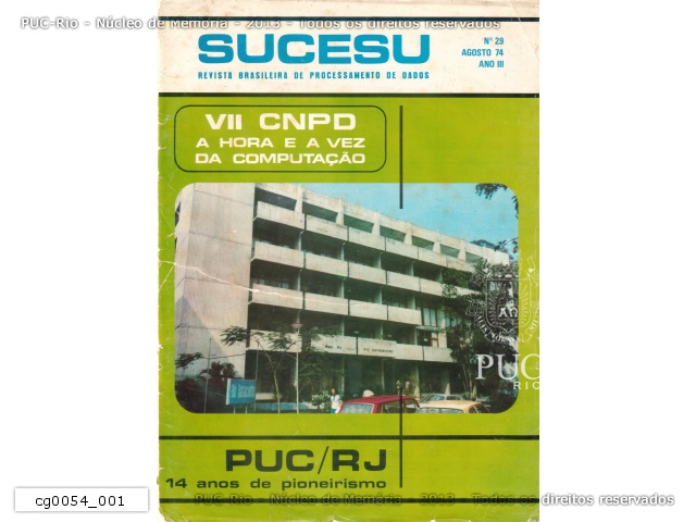 Revista Brasileira de Processamento de Dados - SUCESU, Ano III, no.29, Agosto 74 - cg0054_001 cg0054_001 8/1974 Capa da revista, com chamada da matéria e foto do RDC. 14 anos de pioneirismo.