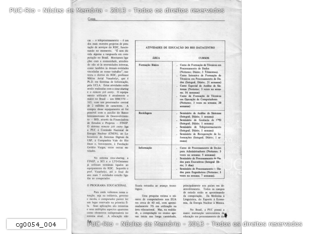 Revista Brasileira de Processamento de Dados - SUCESU, Ano III, no.29, Agosto 74 - cg0054_004 cg0054_004 1974 Cont.matéria - 14 anos de pioneirismo - tabela com atividades de educação do RDC