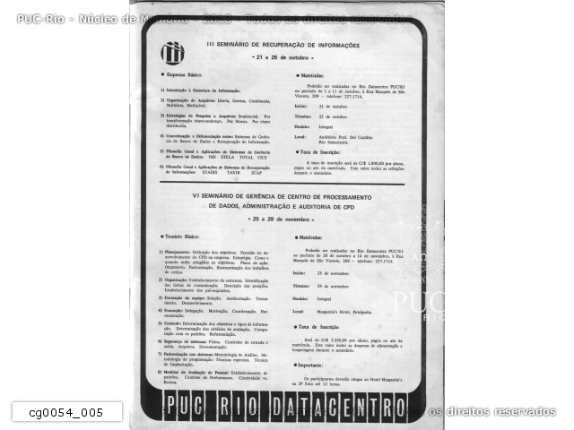 Revista Brasileira de Processamento de Dados - SUCESU, Ano III, no.29, Agosto 74 - cg0054_005 cg0054_005 1974 Programa dos seminários II Seminário de Recuperação de Informações e do VI Seminário de Gerência de Centro de Processamento de Dados