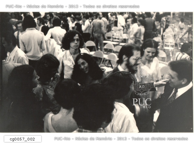 Fotos de professores e alunos do Departamento de História (à época, História e Geografia) da PUC-Rio, em torno de 1976-1977, em formatura e seminário.
